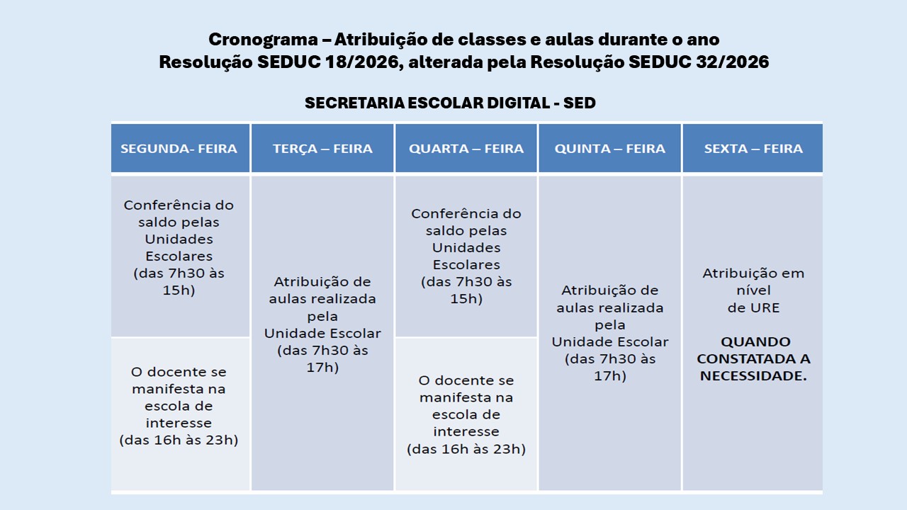 – A atribuição durante o ano letivo iniciar-se-á em 05/02/2025, nos termos do artigo 42 da Resolução SEDUC 95, de 07/11/2024, que deverá ocorrer diariamente e de forma imediata ao surgimento de classes ou aulas, livres ou em substituição.